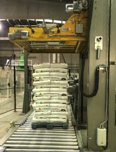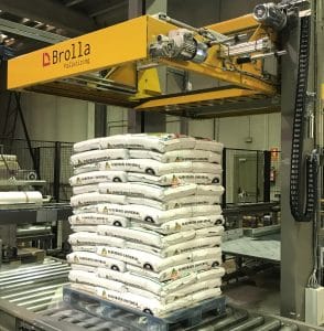 Los paletizadores por capas de Brolla son la solución ideal para apilar productos a un ritmo muy alto. Además, consta de compactadores verticales y horizontales, permitiendo compactar cada capa. Esto gana importancia en sacos con producto polvoriento.